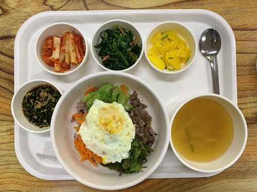 금일 중식 식단은 비빔밥(죽/잡곡밥) / 팽이미소된장국 / 상추&오이&계란&당근채&소고기 / 시금치나물무침 / 흰짠지무무침 / 김치 였습니다~!