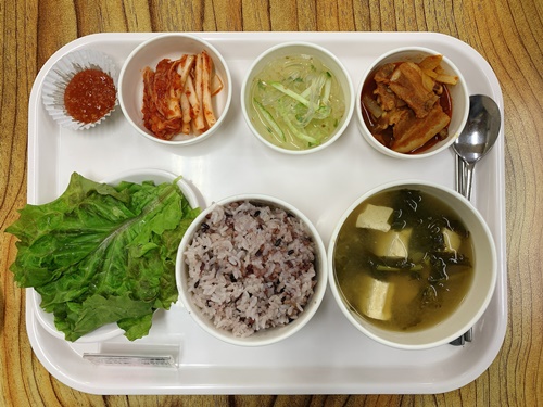 금일 중식 식단은 백미밥(죽/잡곡밥) / 시레기두부된장국 / 오삼불고기 / 상추&쌈장 / 오이무무채무침 / 김치 였습니다~!