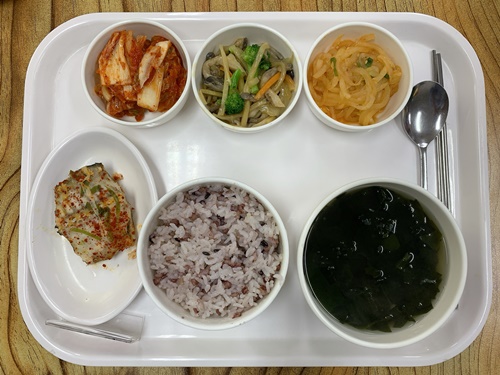 금일 중식 식단은 백미밥(죽/잡곡밥) / 미역국 / 삼치찜&양념장 / 느라티죽순3색볶음 / 노각무침 / 김치 였습니다~!