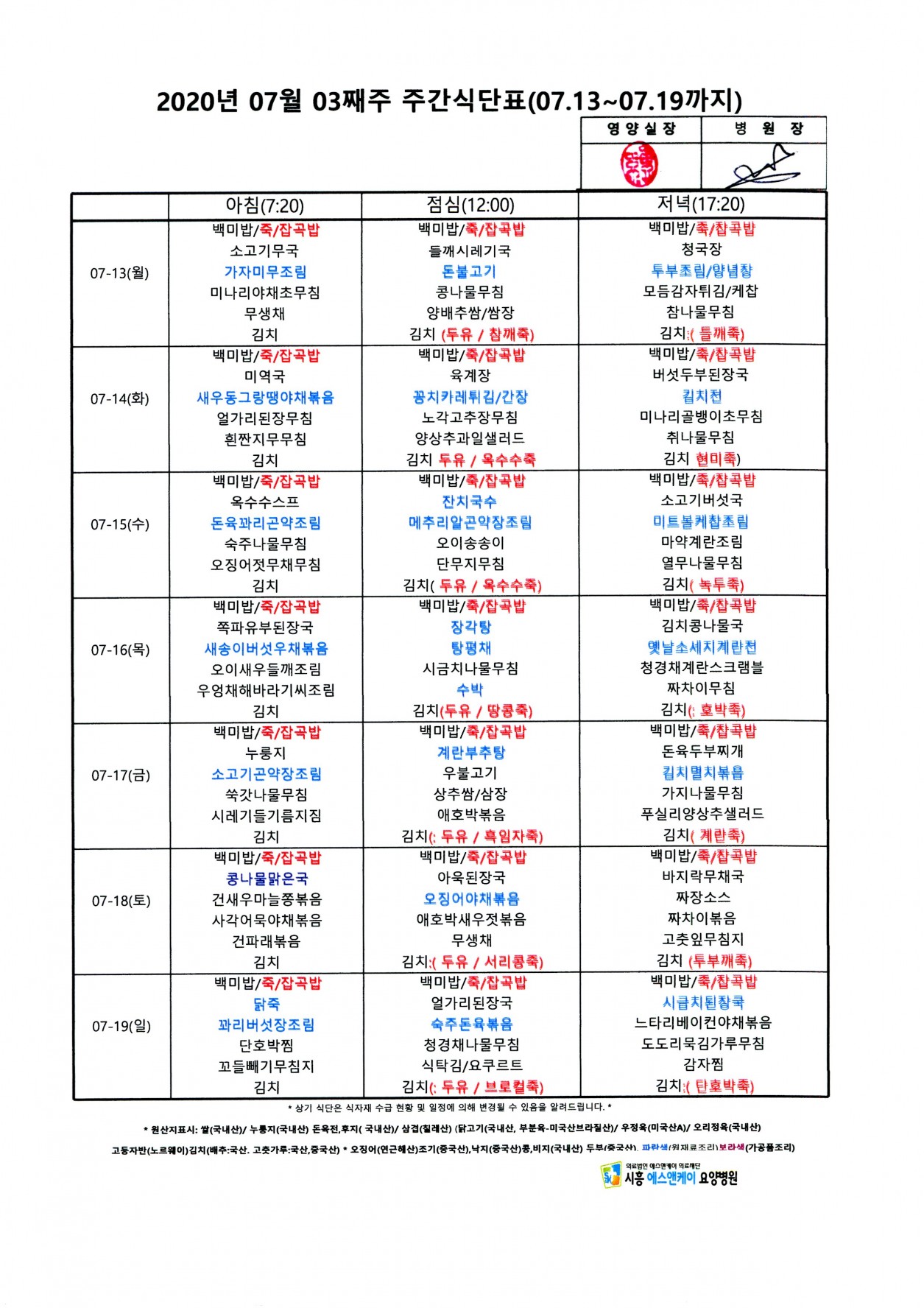 2020년 7월 3째주 주간식단표