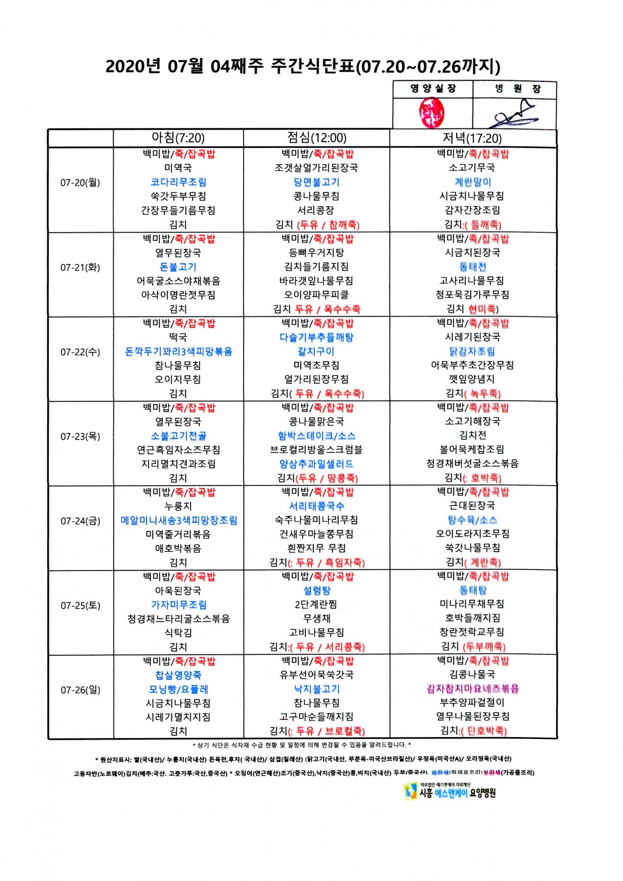 2020년 7월 4째주 주간식단표