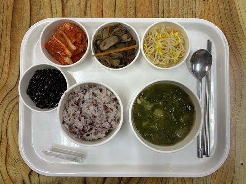 금일 중식 식단은 백미밥(죽/잡곡밥) / 조갯살얼가리된장국 / 당면불고기 / 콩나물무침 / 서리콩장 / 김치 였습니다~!