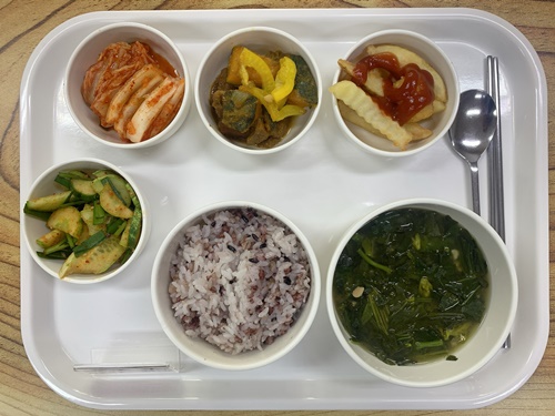 금일 중식 식단은 백미밥(죽/잡곡밥)/ 보리새우아욱된장국 / 돈사태단호박조림 / 냉동모듬감자튀김 / 오이송송이새우젓무침 / 김치 였습니다~!