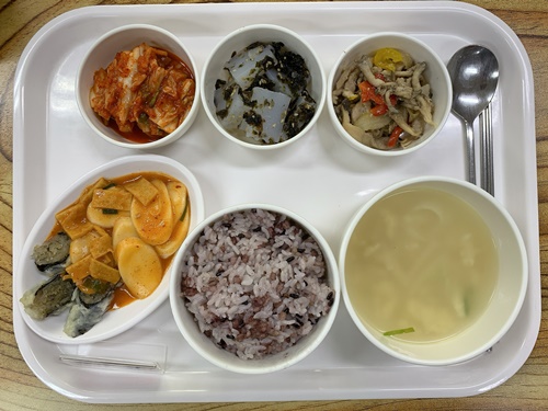 금일 중식 식단은 백미밥(죽/잡곡밥)/ 유부팽이된장국 / 국물떡볶이&순대&김말이 / 돈채느타리볶음 / 청포김가루무침 / 김치 였습니다~!