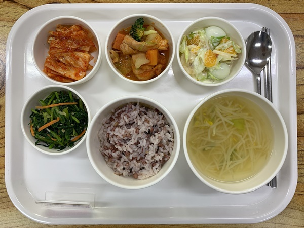 금일 중식 식단은 백미밥(죽/잡곡밥)/ 콩나물맑은국 / 닭감자조림 / 양상추과일샐러드 / 쑥갓나물무침 / 김치 였습니다~!