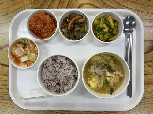 금일 중식 식단은 백미밥(죽/잡곡밥)/ 닭계장 / 우채버섯볶음 / 오이부추겉절이 / 나박김치 / 김치 였습니다~!