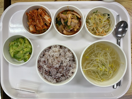 금일 중식 식단은 백미밥(죽/잡곡밥)/ 콩나물국 / 오징어야채볶음 / 애호박새우젓볶음 / 숙주나물무침 / 김치 였습니다~!