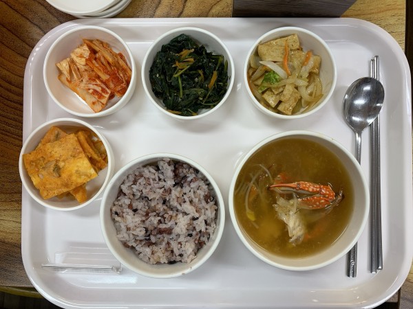 금일 중식 식단은 백미밥(죽/잡곡밥)/ 꽃게해물탕 / 김치전 / 사각어물굴소스야채볶음 / 취나물무침 / 김치 였습니다~!