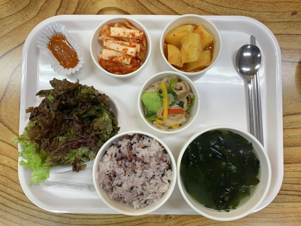 금일 중식 식단은 백미밥(죽/잡곡밥)/ 홍합미역국 / 대패삼겹살야채볶음 / 상추&쌈장 / 감자조림 / 김치 였습니다~!