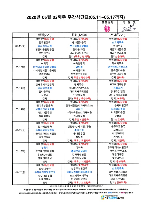 2020년 5월 2째주 주간식단표