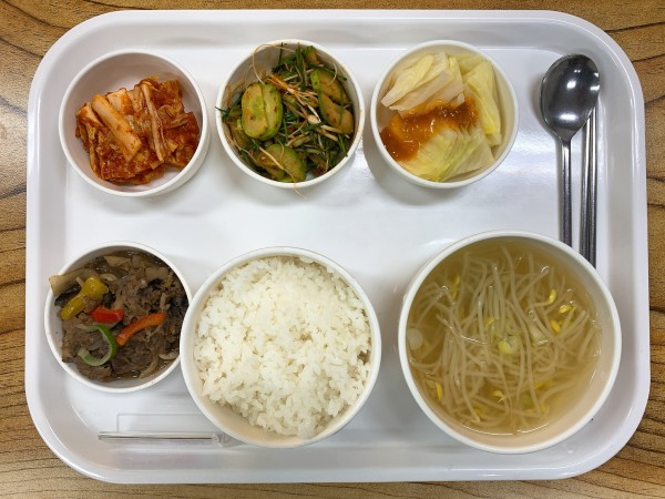 금일 중식 식단은 백미밥(죽/잡곡밥)/ 콩나물맑은국 / 우불고기 / 양배추쌈&쌈장 / 오이달래무침 / 김치 였습니다~!