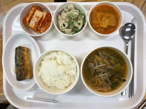 금일 중식 식단은 백미밥(죽/잡곡밥)/ 육개장 / 꽁치카레구이 / 김치들기름지짐 / 연근흑임자샐러드 / 김치 였습니다~!