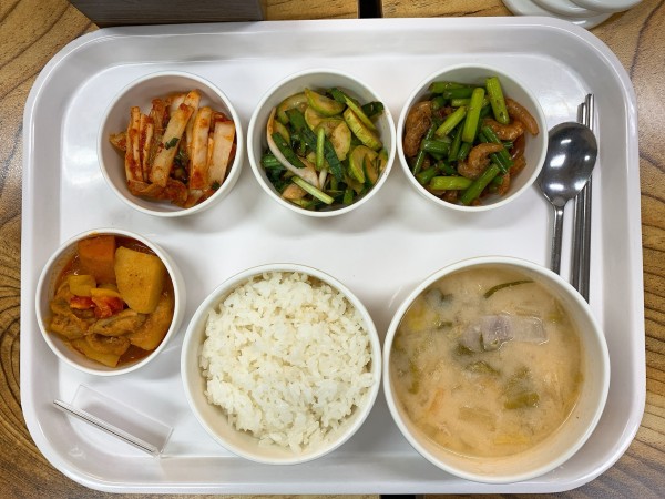 금일 중식 식단은 백미밥(죽/잡곡밥)/ 콩비지찌개 / 닭감자조림 / 건새우마늘쫑볶음 / 오이송송이부추겉절이 / 김치 였습니다~!