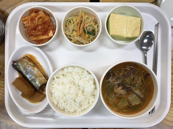 금일 중식 식단은 백미밥(죽/잡곡밥)/ 육개장 / 꽁치무조림 / 계란3단찜 / 콩나물무침 / 김치 였습니다~!