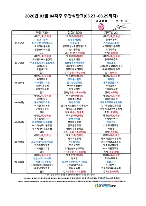 2020년 3월 4째주 주간식단표