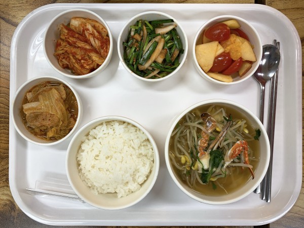 금일 중식 식단은 백미밥(죽/잡곡밥)/ 꽃게콩나물탕 / 김치삼겹살지짐 / 부추양파겉절이 / 과일샐러드 / 김치 였습니다~!
