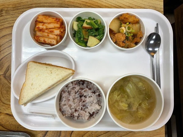 금일 중식 식단은 백미밥(죽/잡곡밥)/ 단배추된장국 / 닭감자조림 / 감자샐러드샌드위치 / 치커리사과겉절이 / 김치 였습니다~!