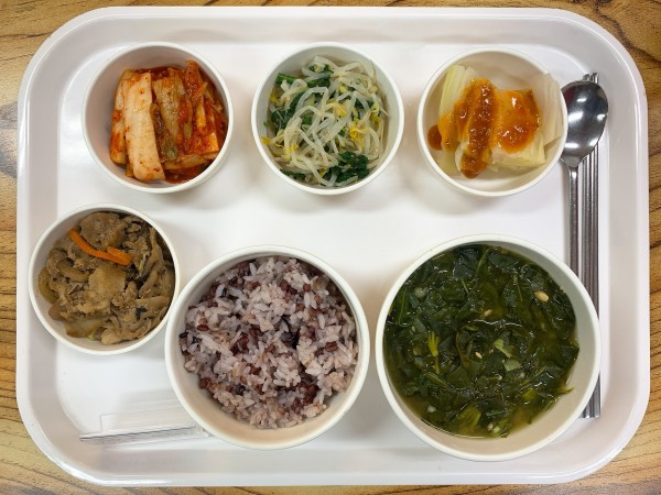 금일 중식 식단은 백미밥(죽/잡곡밥)/ 아욱된장국 / 돈육간장불고기 / 양배추쌈 / 숙주쑥갓무침 / 김치 였습니다~!
