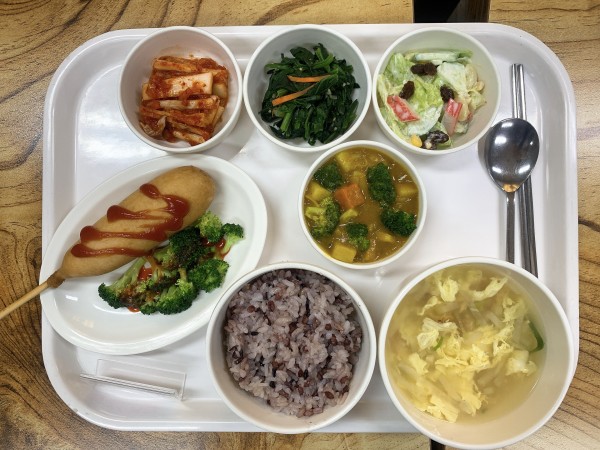 금일 중식 식단은 백미밥(죽/잡곡밥)/ 북어계란국 / 카레라이스소스와 핫도그 / 양배추마카로니샐러드 / 시금치나물 / 김치 였습니다~!