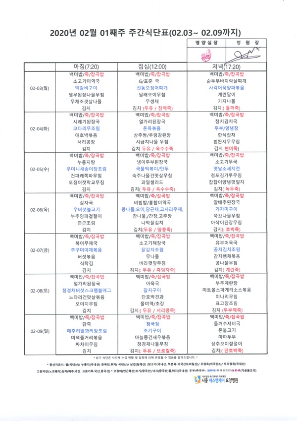 2020년 2월 1째주 주간식단표