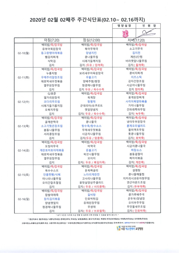 2020년 2월 2째주 주간식단표