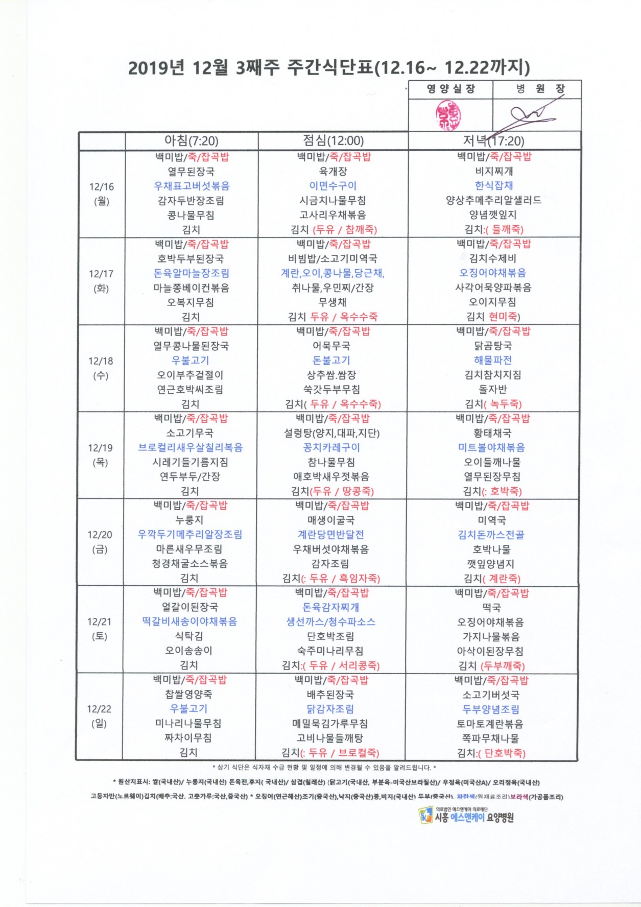 2019년 12월 3째주 주간식단표