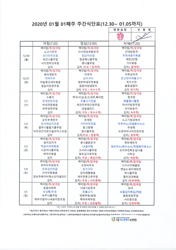 2020년 1월 1째주 주간식단표