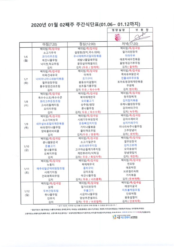 2020년 1월 2째주 주간식단표