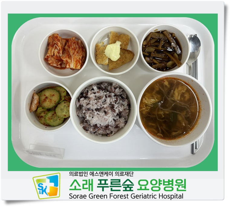 ▷ 04월 16일 중식 : 백미밥(죽/잡곡밥) /육개장/ 생선까스&타르소스/ 우엉채견과류조림/ 오이송송무침 / 김치 ◁