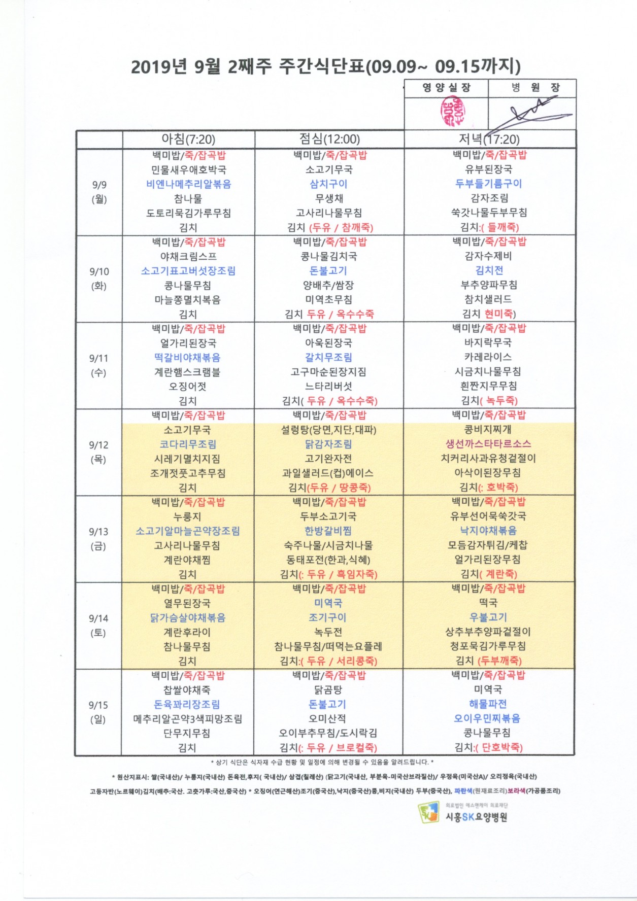 2019년 9월 2째주 주간식단표