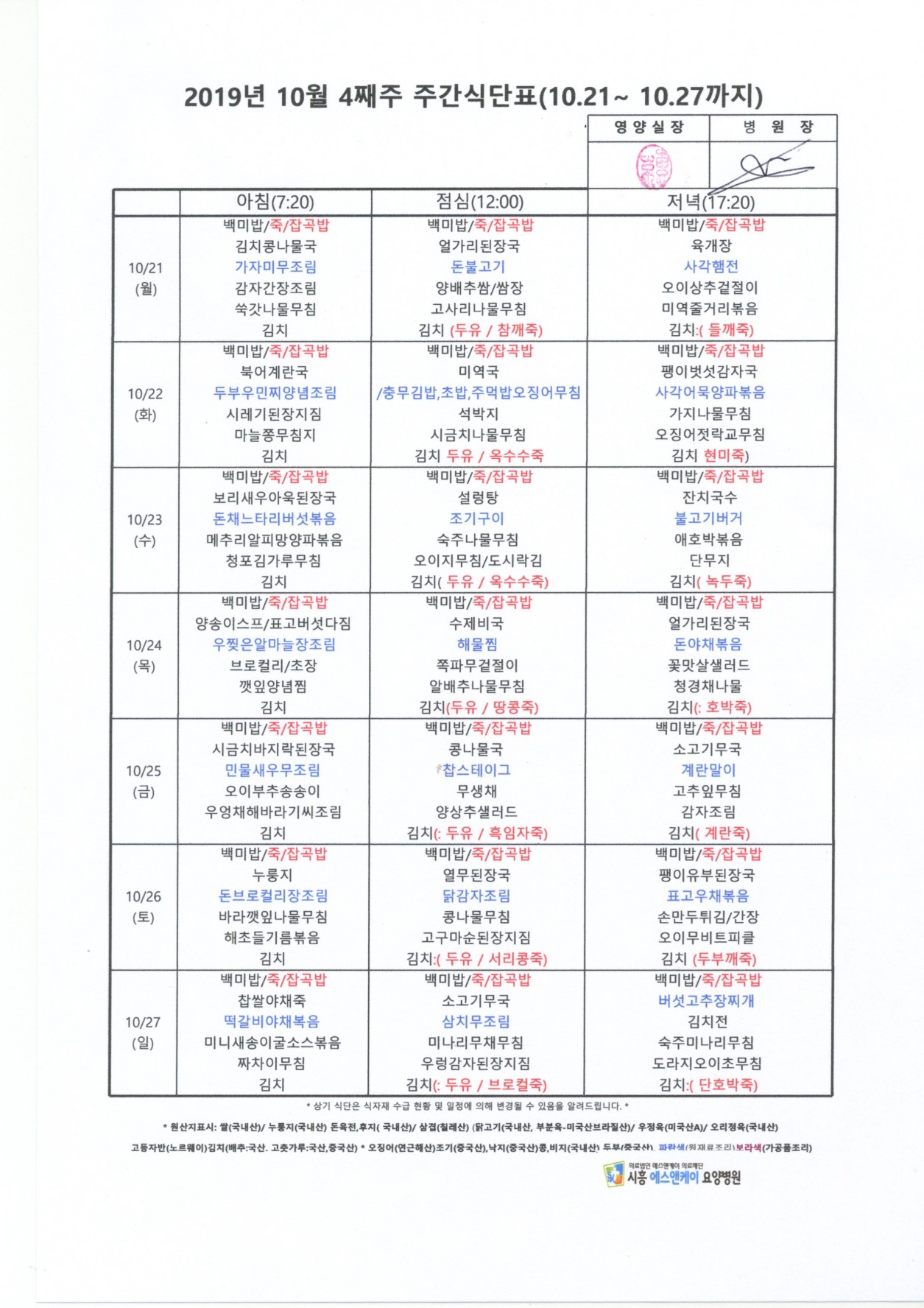 2019년 10월 4째주 주간식단표