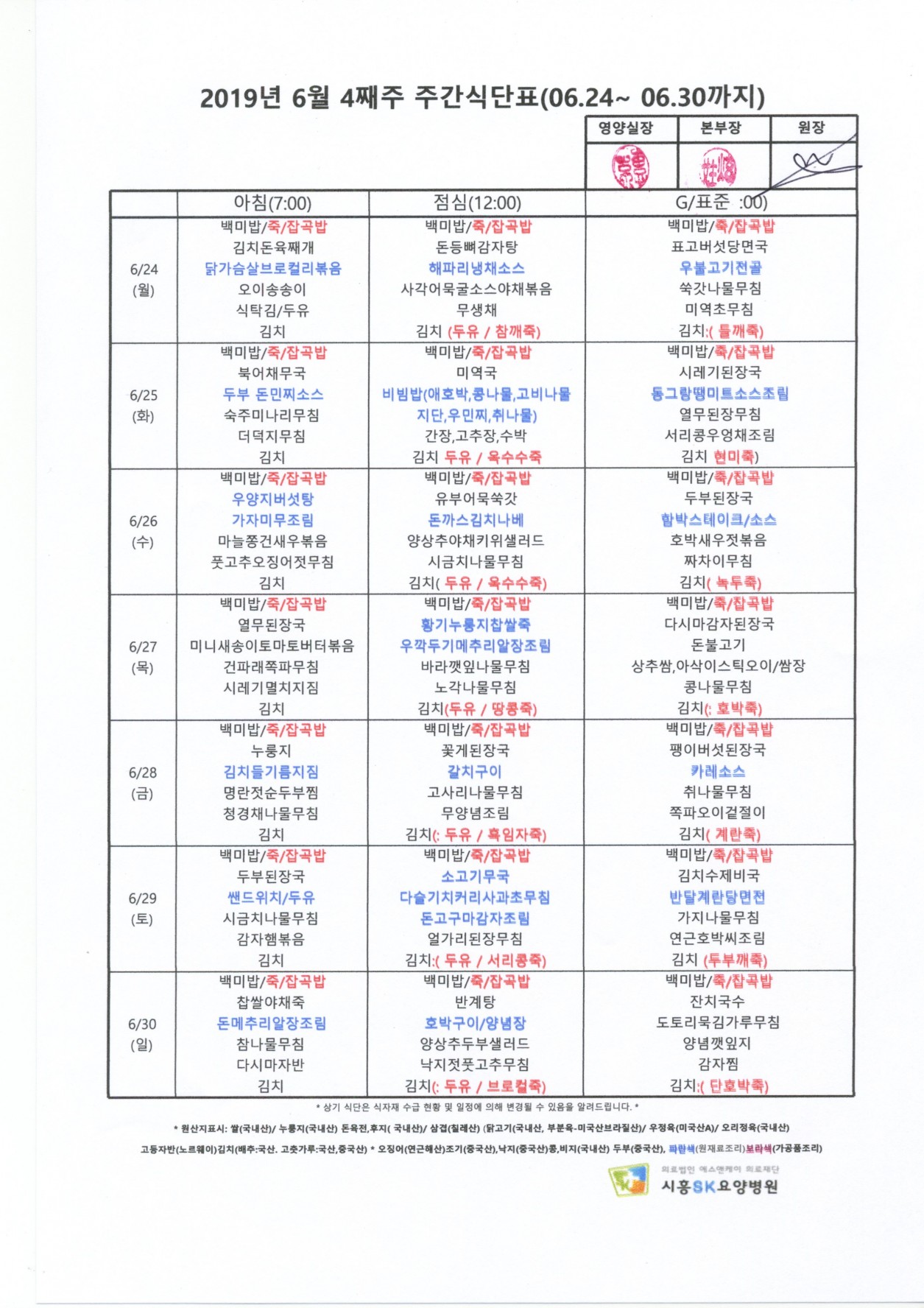 2019년 6월 4째주 주간식단표
