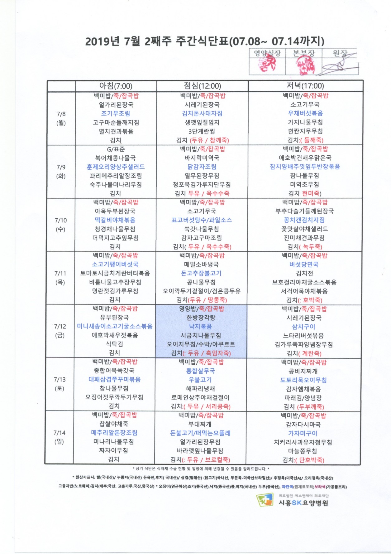 2019년 7월 2째주 주간식단표