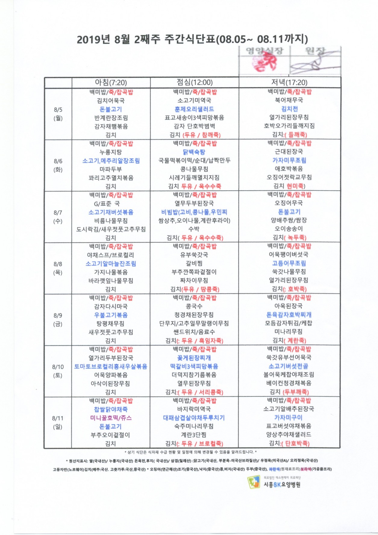 2019년 8월 2째주 주간식단표