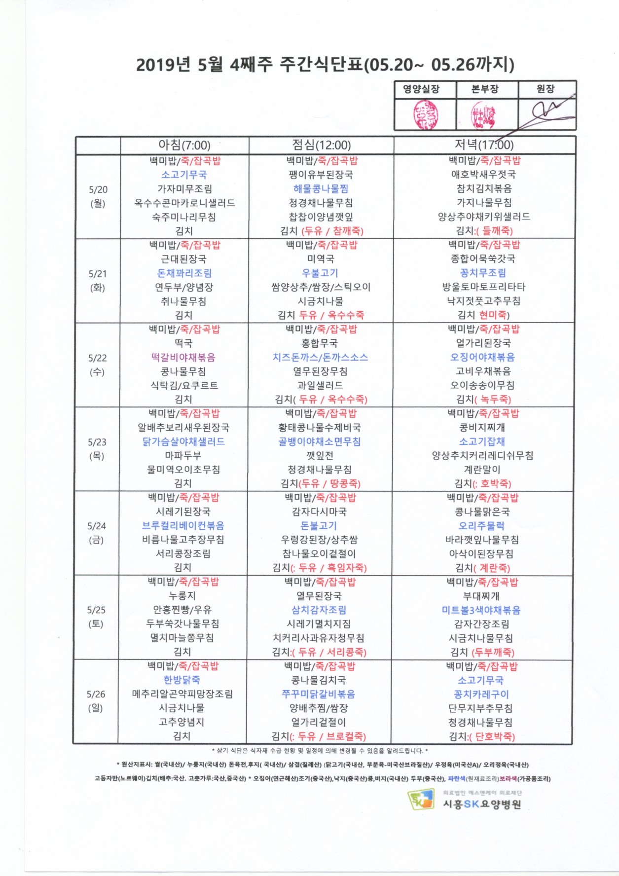 HOME > 병원소식 > 영양식단표