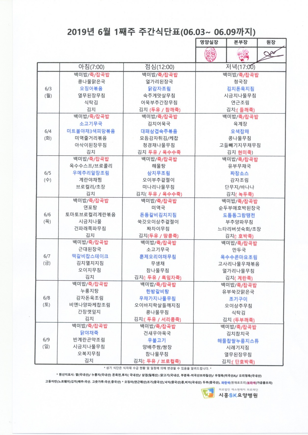 2019년 6월 1째주 주간식단표
