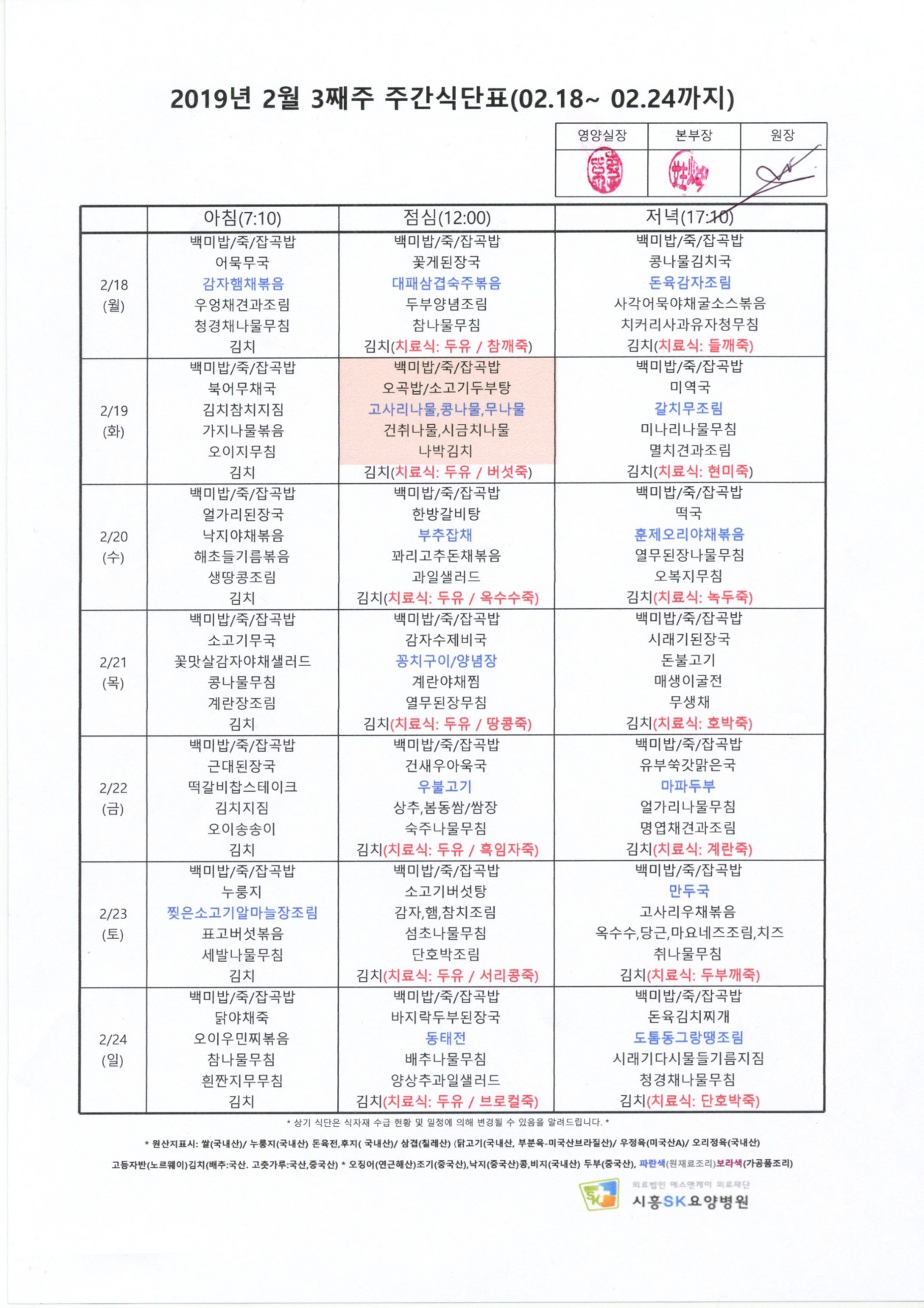 2019년 2월 3째주 주간식단표