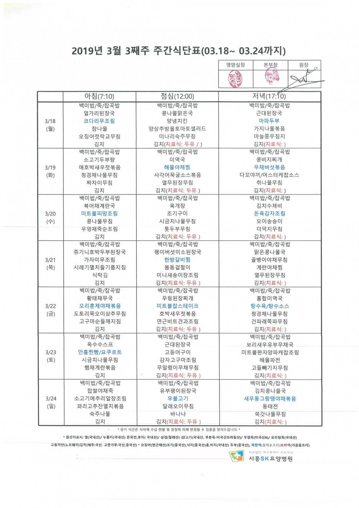 2019년 3월 3째주 주간식단표