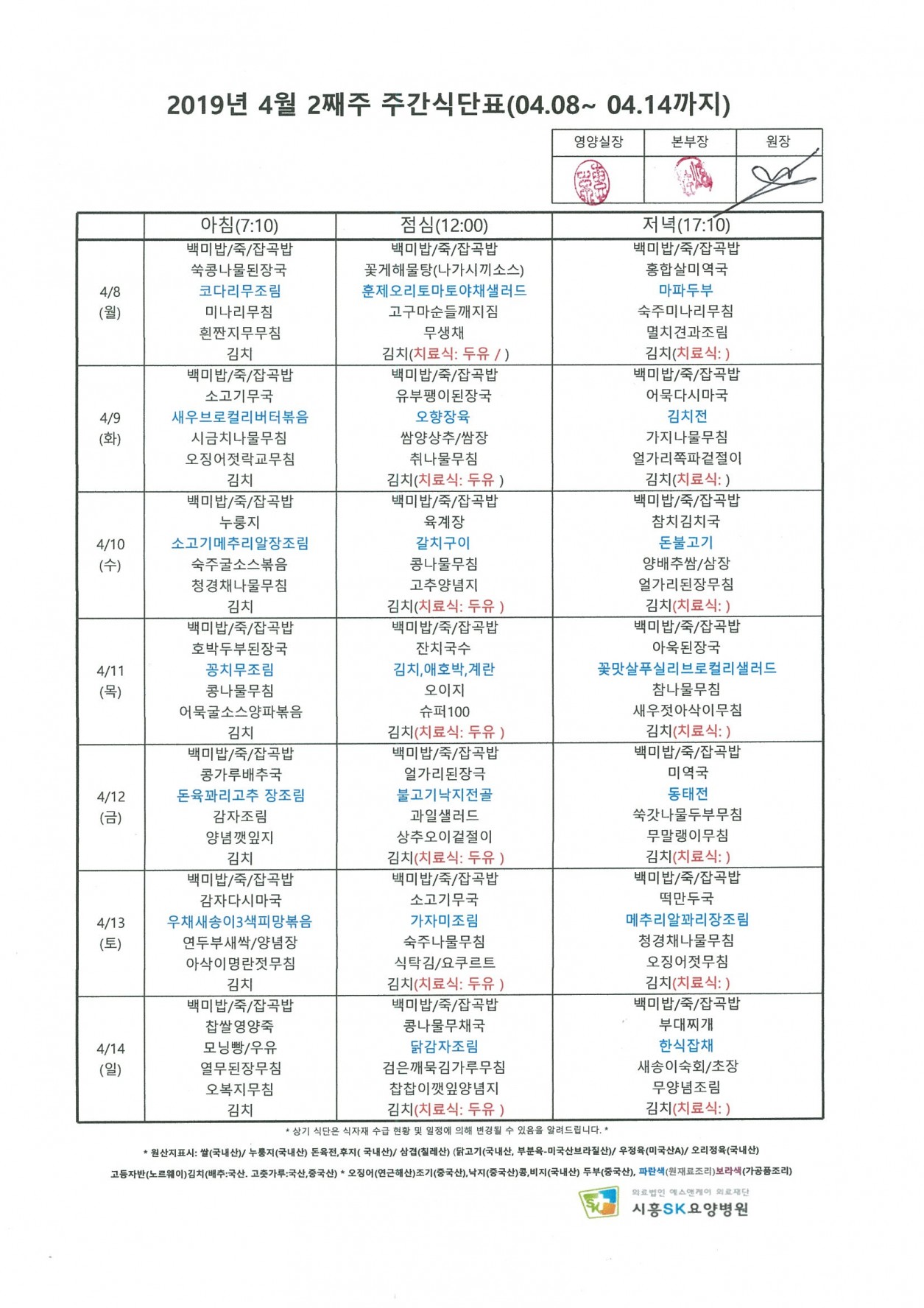 2019년 4월 2째주 주간식단표