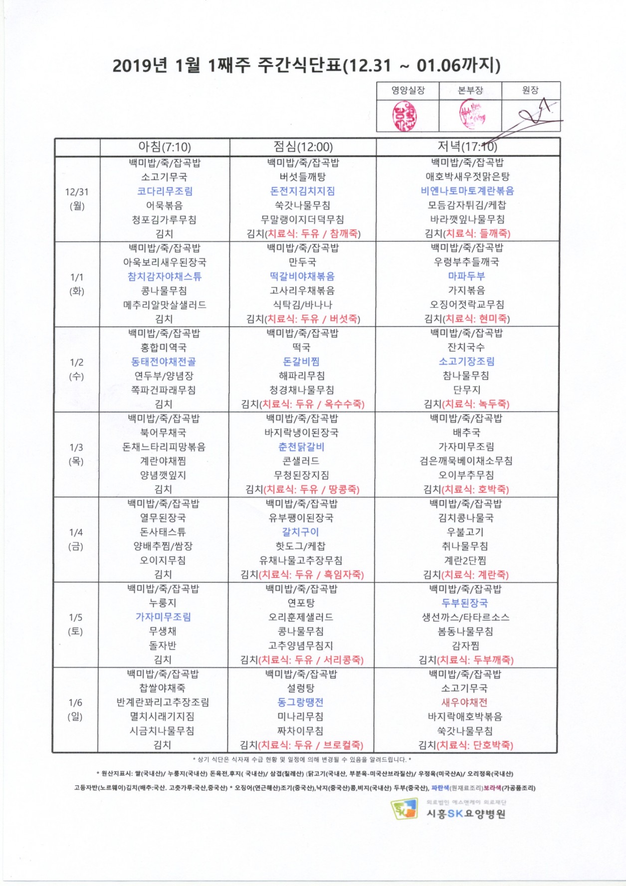 2019년 1월 1째주 주간식단표