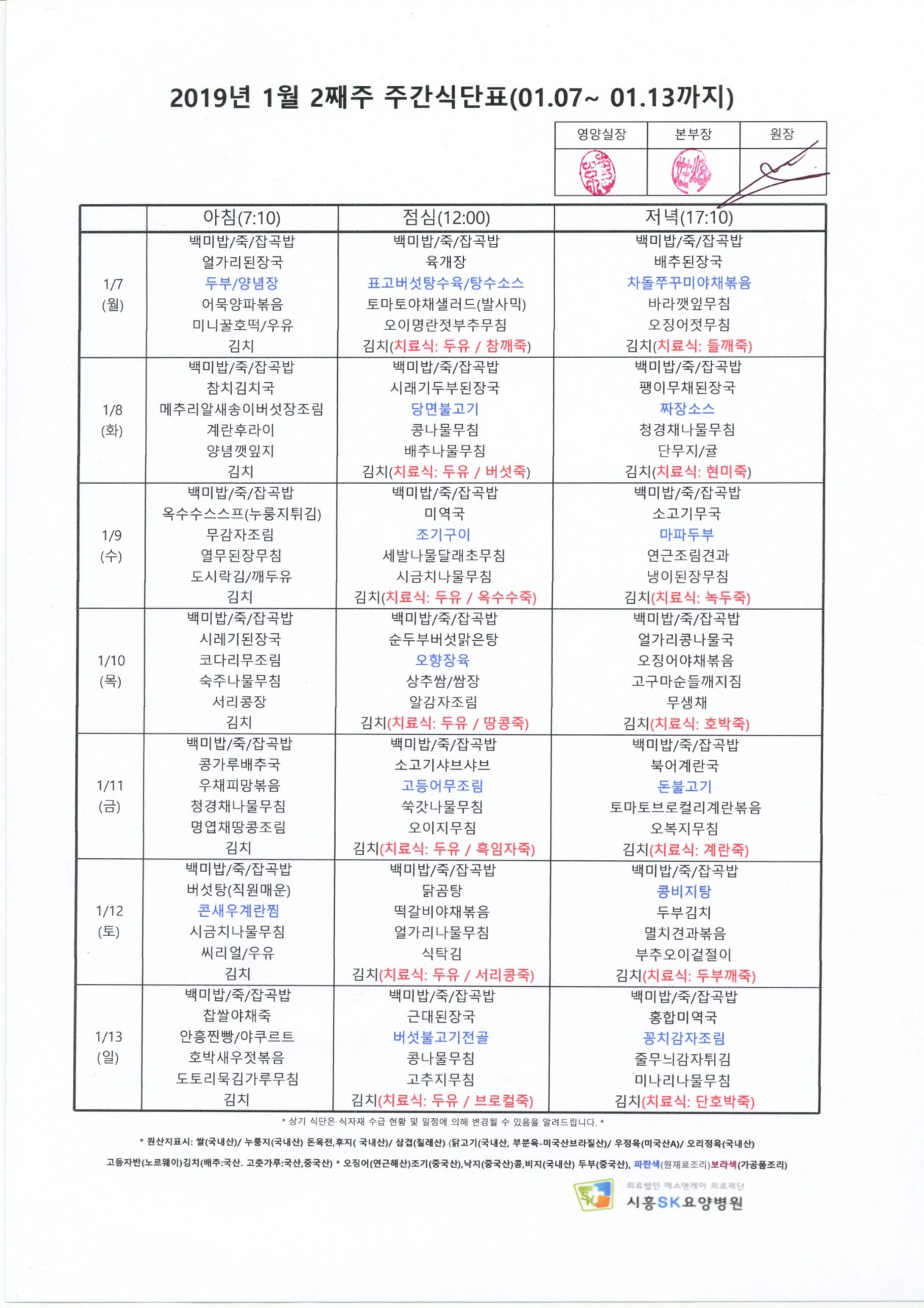 2019년 1월 2째주 주간식단표
