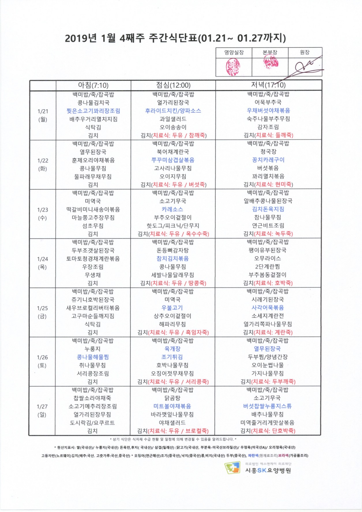HOME > 병원소식 > 영양식단표