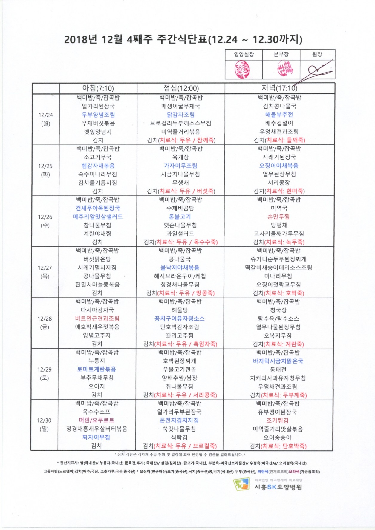 HOME > 병원소식 > 영양식단표
