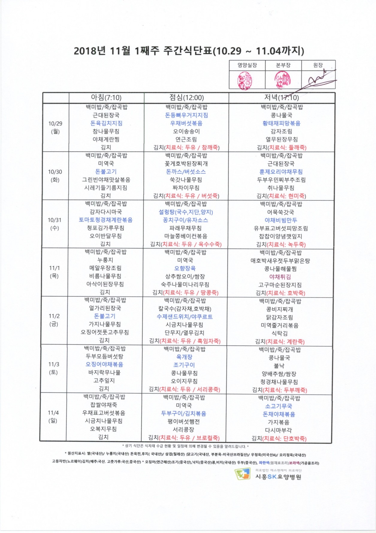 2018 년 11월 1째주 주간식단표