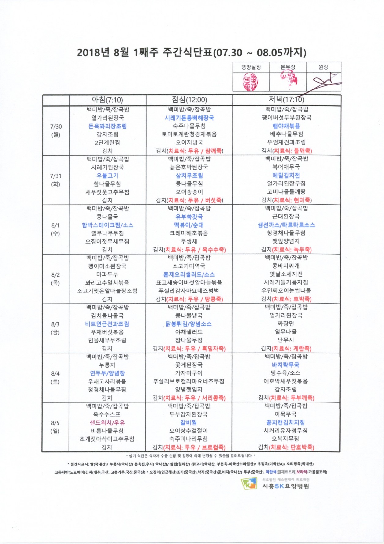 HOME > 병원소식 > 영양식단표