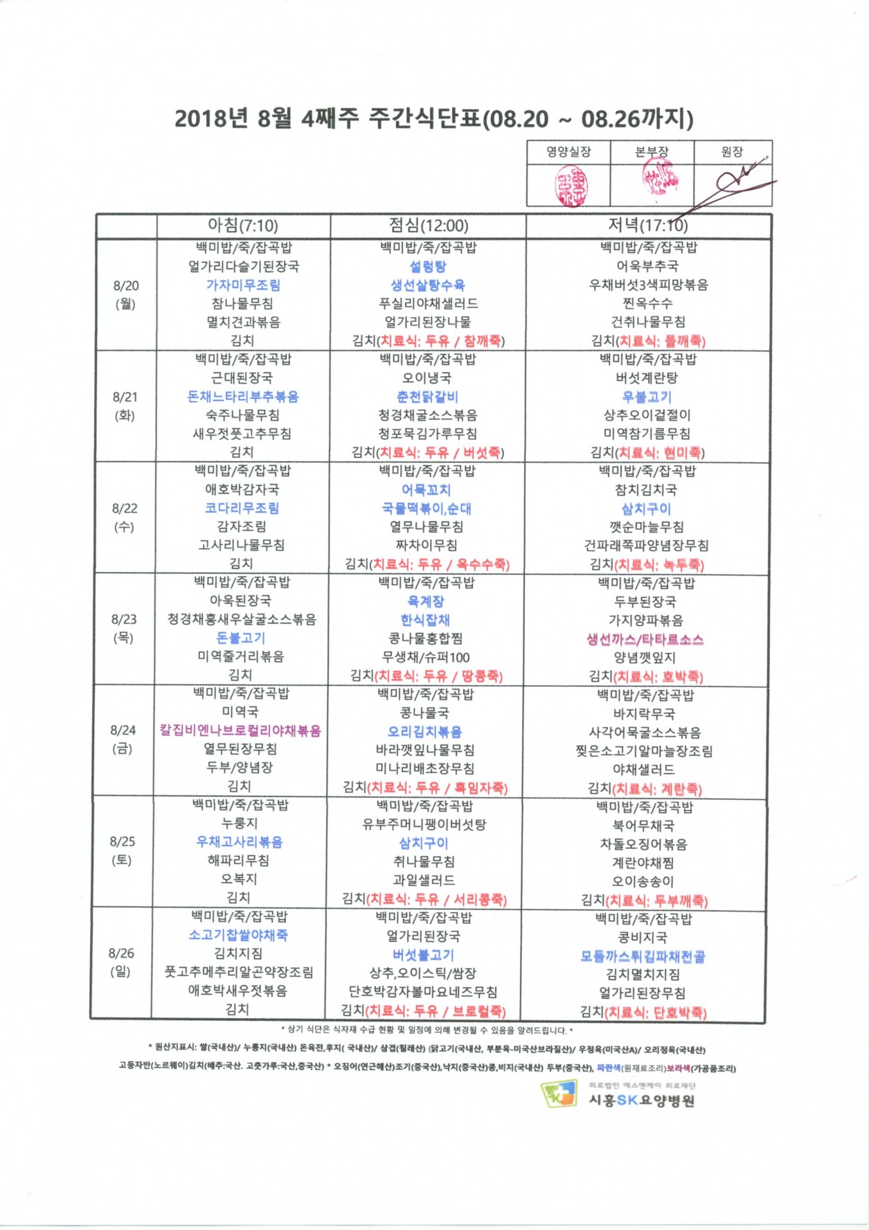 2018 년 8월 4째주 주간식단표