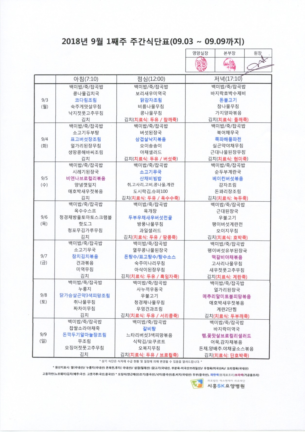 2018 년 9월 1째주 주간식단표