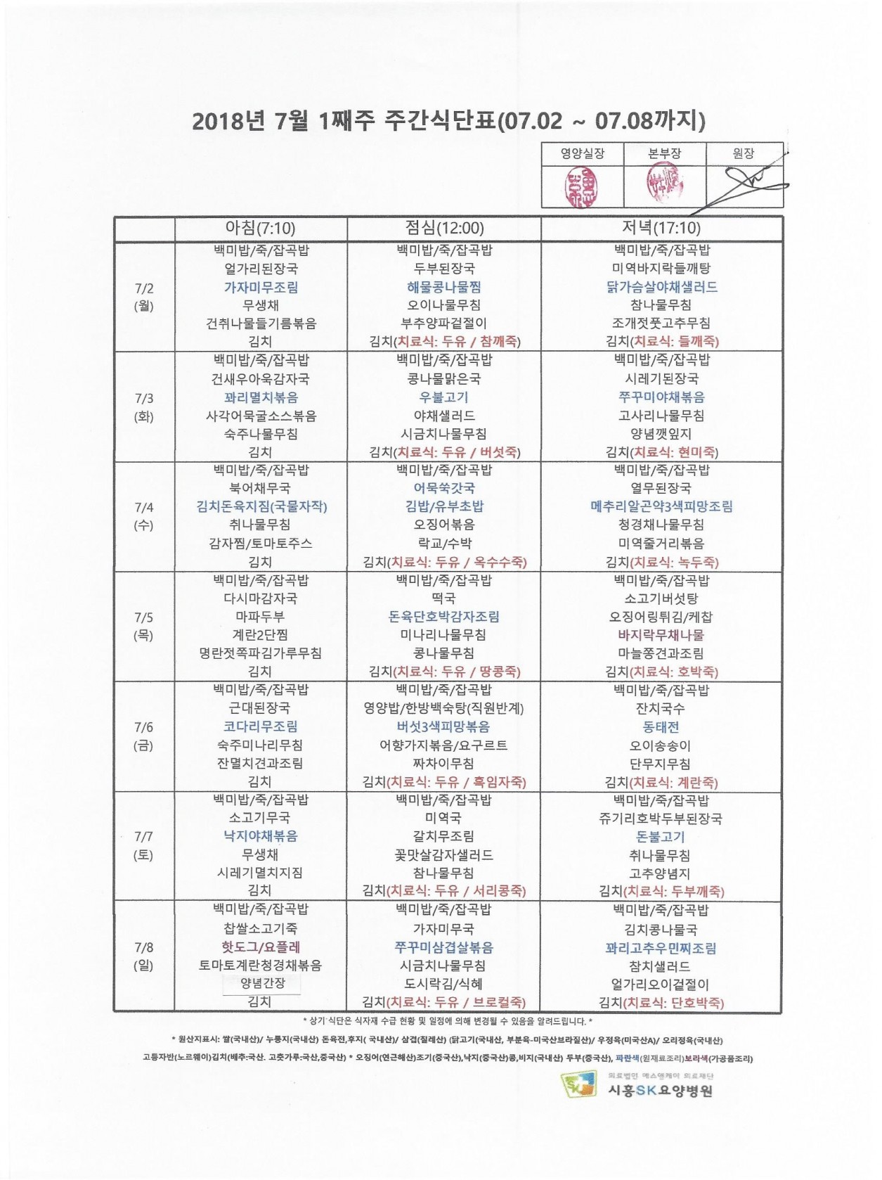 2018 년 7월 1째주 주간식단표