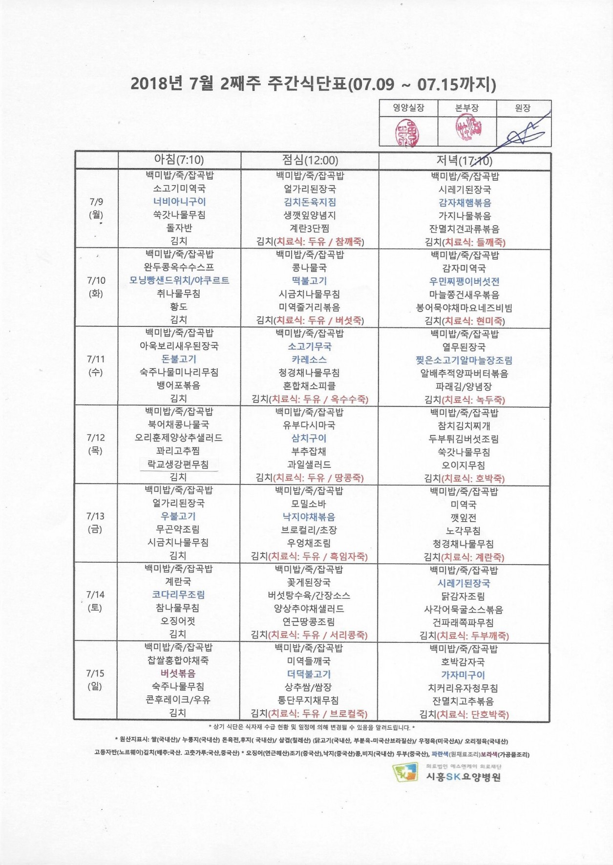 HOME > 병원소식 > 영양식단표