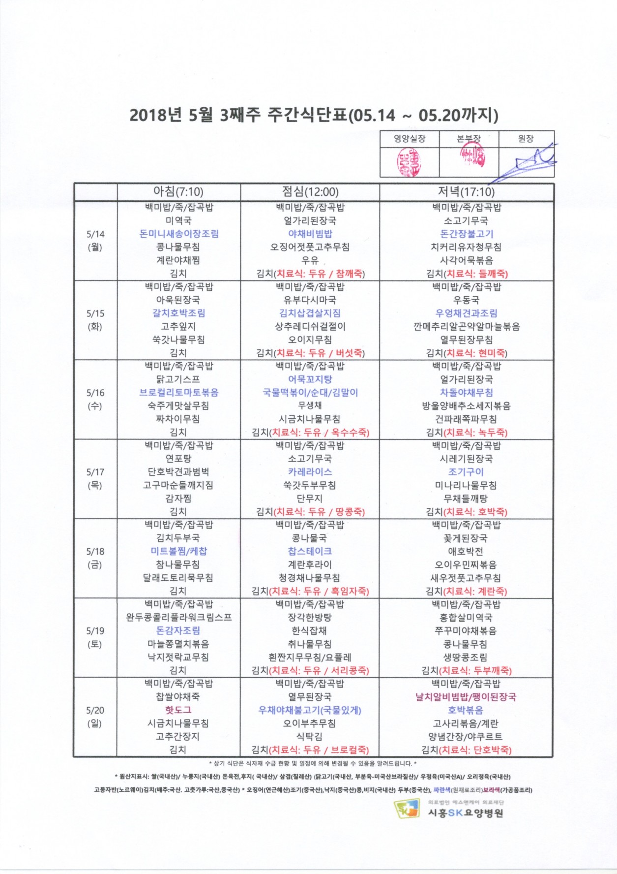 HOME > 병원소식 > 영양식단표